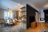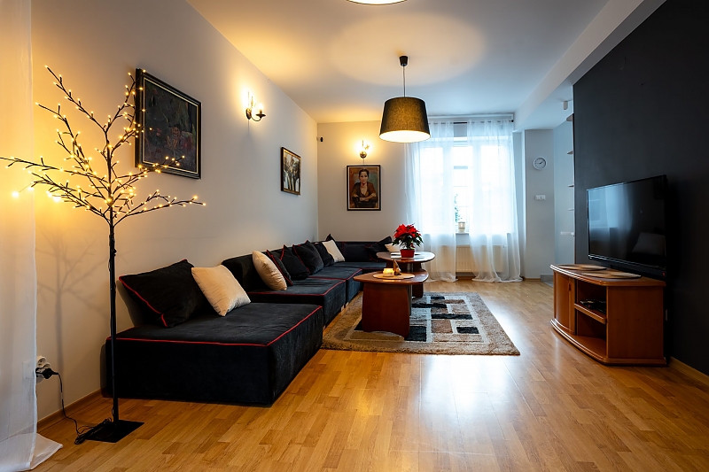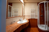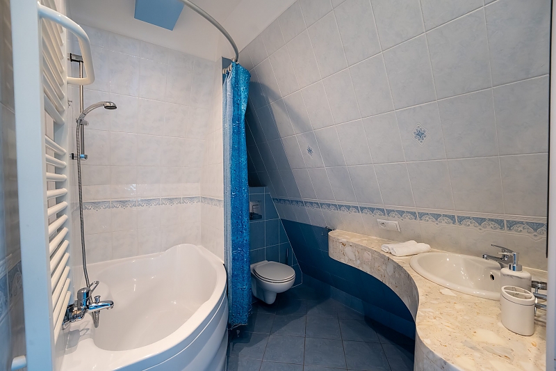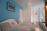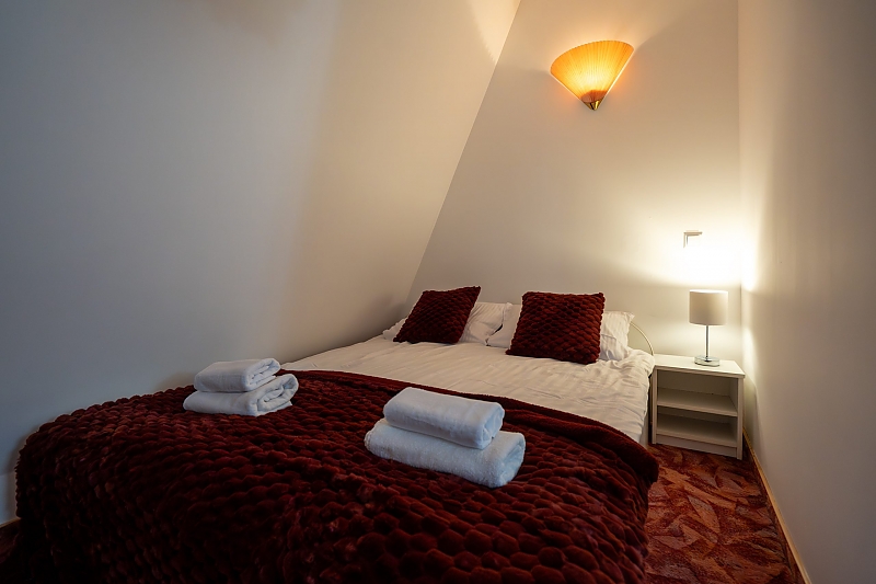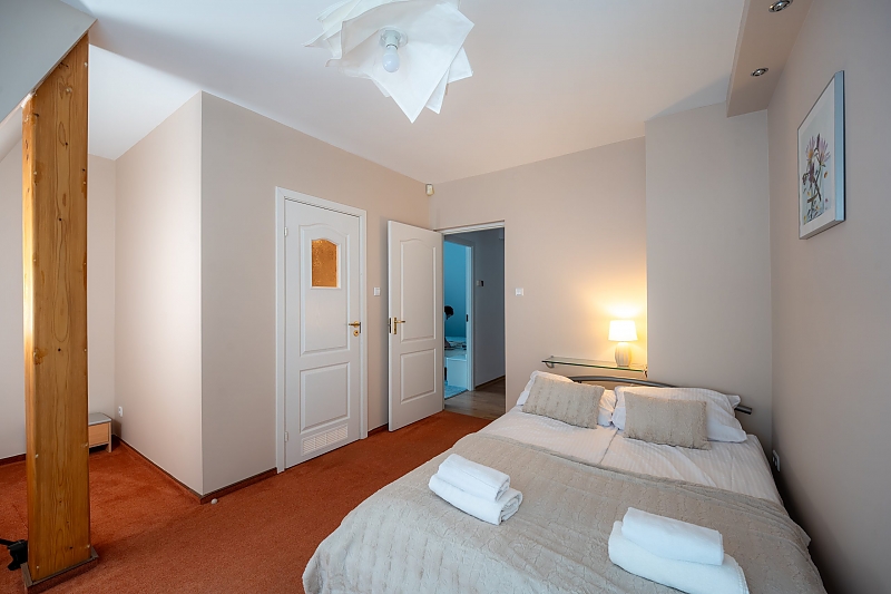 - apartament na 4 osoby - mniejszą część domu przeznaczoną dla czterech osób w której znajdują się dwa pokoje (sypialnia z dużym małżeńskim łóżkiem i pokój dzienny z rozkładanym narożnikiem), wyposażona kuchnia i duża nowoczesna łazienka.
