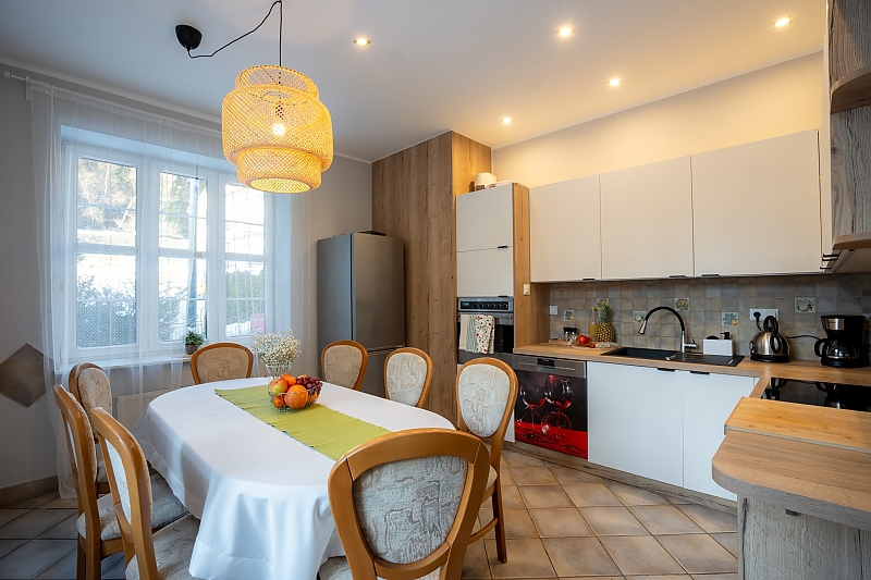 Sypialnie w dużej części posiadają własne łazenki, salon z kominkiem i wyjściem na taras oraz duża w pełni wyposażona kuchnia pozwalaja na komfort wypoczynku.