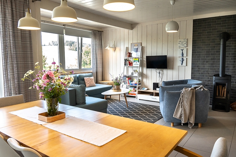 Apartament nr 5 z 2 sypialniami, jadalnią, kuchnią, salonemz kominkiem , tv oraz rozkładaną kanapą, osobą ubikacją oraz łazienką z wanną i prysznicem, przeznaczony jest dla 6 osób (60 m2).