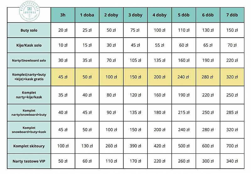Cennik wypożyczalni nart w Tyliczu jest przejrzysty – dostępne są dwie opcje wypożyczenia: na 3 godziny lub na dobę. Ile kosztuje wypożyczenie nart? W zależności od modelu, cena wypożyczenia nart zaczyna się już od 40 zł (za 3-godzinną sesję) i 50 zł (za pełną dobę). Dla miłośników zjazdów na desce mamy także ofertę snowboardów – cena wypożyczenia snowboardu w Tyliczu to 40 zł na 3 godziny lub 50 zł za dobę. Wszystkie sprzęty są regularnie serwisowane i gotowe do natychmiastowego użycia. Dokładne informacje o kosztach wynajęcia sprzętu znajdziesz w załączonej w galerii tabeli.